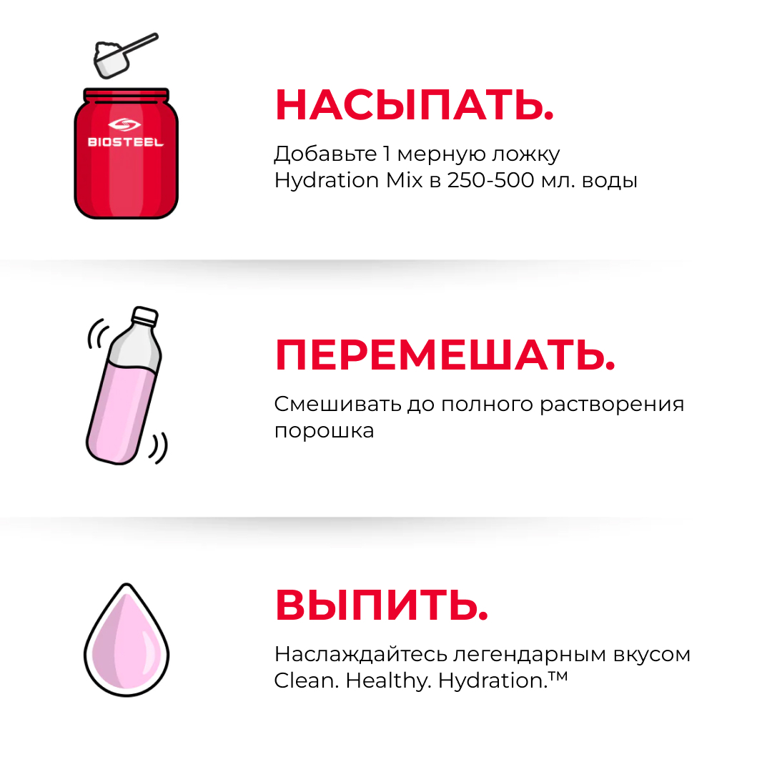 Изотоник Hydration Mix от BioSteel разработан с учетом требований спортсменов на основе натуральных ингредиентов для насыщения электролитами, аминокислотами растительного происхождения и витаминами группы В, необходимыми для пополнения запасов энергии организма до, во время и после тренировок или в периоды, когда требуется повышенная концентрация внимания.