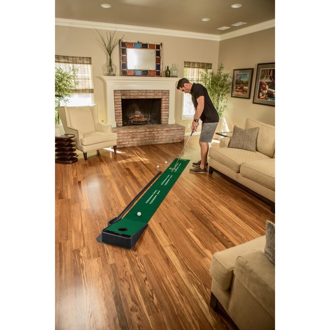 Изготовленная из материала, который имитирует настоящую стриженную зеленую траву с подъемом на конце, дорожка позволит вам отрабатывать точность попадания в лунку даже у вас дома или в офисе. На нее нанесены отметки (0,9 м, 1,5 м, 2 м), с помощью которых можно правильно встать в стойку, сделать замах и завершить удар. Вы сможете заниматься непрерывно, концентрируясь на своих движениях и скорости — сделайте свою тренировку максимально эффективной!