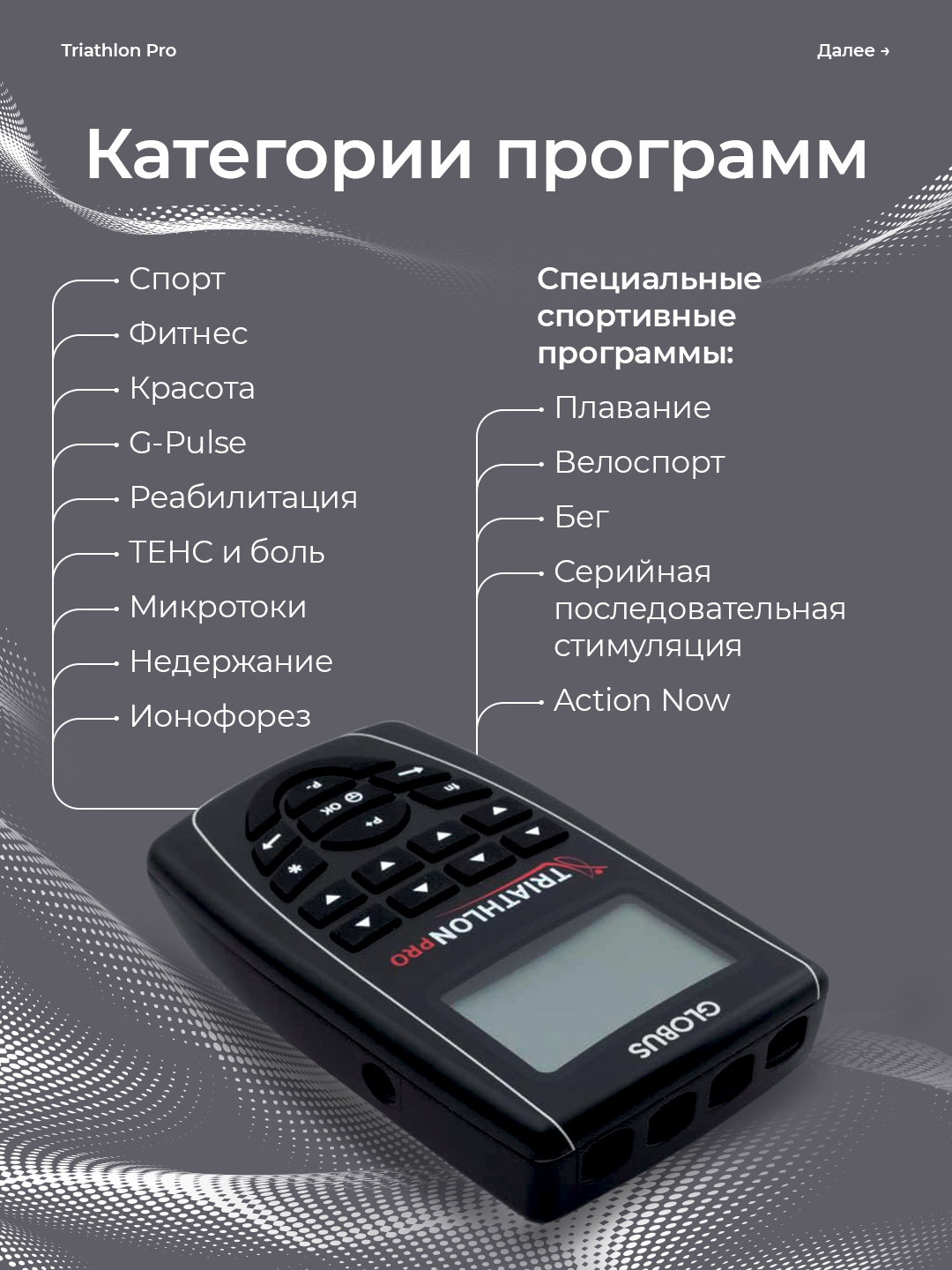 Triathlon Pro — это многофункциональный электростимулятор профессионального уровня, разработанный итальянской компанией GLOBUS специально для спортсменов, тренирующихся в триатлонных дисциплинах: плавание, велоспорт, бег. Устройство сочетает в себе десятки программ для тренировки, восстановления, реабилитации и эстетических процедур.