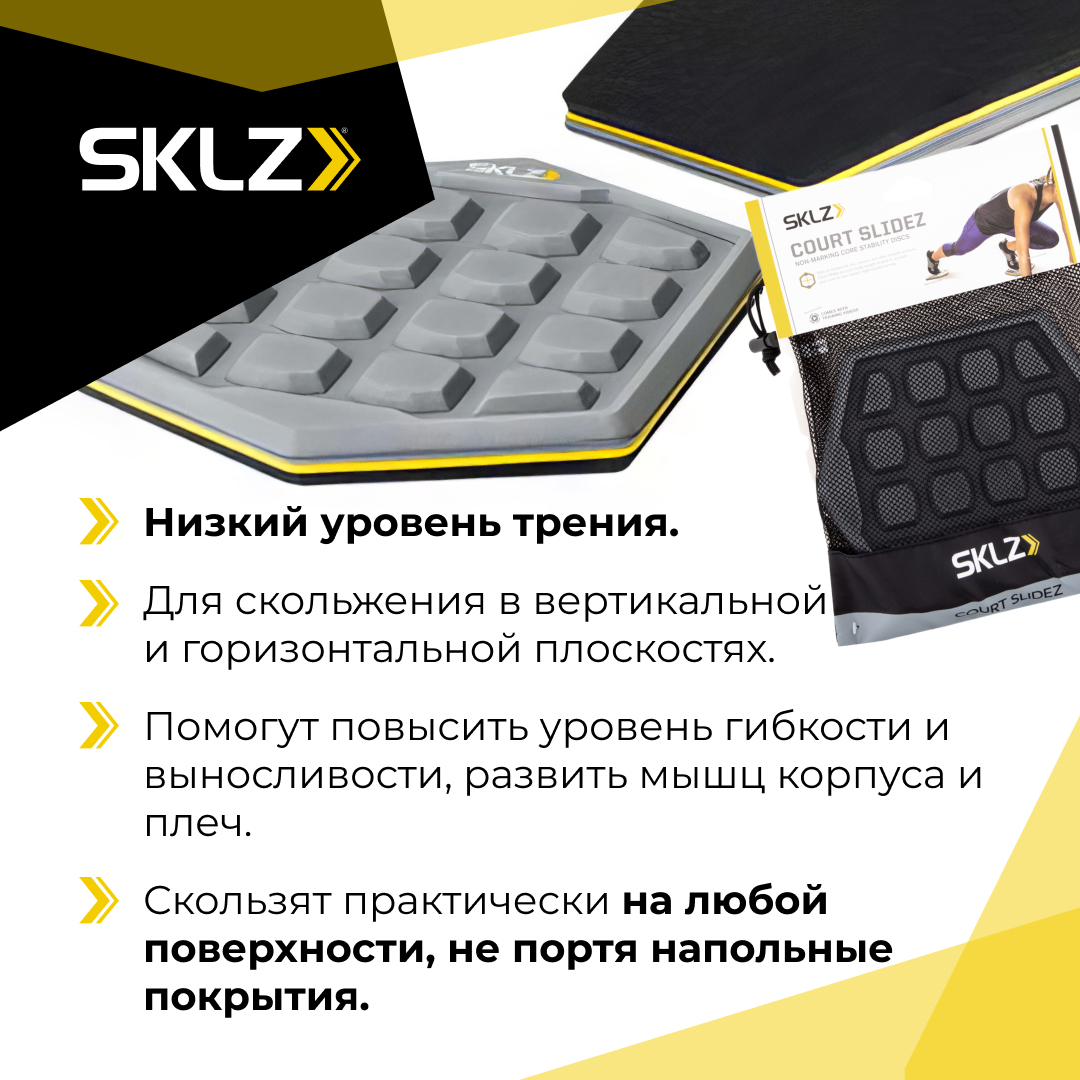 Функциональный тренажер SKLZ Court Slidez - это удобные слайдеры для фитенса с низким уровнем трения. Хотите тренироваться эффективнее-попробуйте диски для скольжения! Слайдеры представляют собой две пластины, положив на них руки или ноги, Вы совершаете скользящие движения по поверхности пола. Тренировочные коврики помогут повысить уровень гибкости и выносливости. Идеально подходят для упражнений с элементами скольжения, делая упражнения с собственным весом более эффективными для мышц корпуса и плеч. А уникальная форма дисков поможет усилить функциональные движения во время тренировки Коврики для тренировок от SKLZ скользят практически на любой поверхности, а не скользящий эргономичный рисунок протектора с обратной стороны ковриков создает отличное сцепление для рук и ног, делая их неподвижными. Фитнес-слайды безопасны для всех видов поверхностей, поэтому их удобно использовать не только в зале, но и в домашних условиях. Безопасно для любых полов: паркета, досок, керамической плитки, ламината.