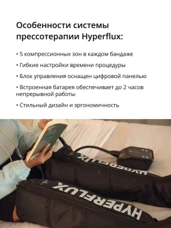 Передовое компрессионное устройство Hyperflux от Hyperice/Normatec. Последовательная пневматическая компрессия, оказываемая на нижние конечности через бандажи устройства, позволит добиться глубокого расслабления, провести эффективный разогрев и сохранить эластичность мышц. Система прессотерапии Гиперфлюкс от Хайперайс/Норматек предназначена для подготовки спортсменов к физической активности, а также для восстановления после повышенных нагрузок и травм. Компрессионная система Hyperflux имеет 2 предустановленных режима работы: Пульсирующий режим Компрессия начинается с области ступней. Каждая из 5 зон бандажа сначала сжимается в импульсном режиме, а затем снижает компрессию по мере того, как сжатие продвигается по зонам вверх от ступни до бедра. После прохождения всех зон цикл начнется заново.Последовательный режим Компрессия также начинается с области ступней. Каждая область бандажа сжимает конечность от стопы к бедру и удерживает давление во всех зонах. После прохождения всех зон цикл возобновляется с нижней зоны бандажа. Количество активированных зон можно выбрать в диапазоне от одной до пяти. Зоны можно отключить от верхней до нижней части бандажа, по одной зоне за раз. Особенности системы прессотерапии Hyperflux: 5 компрессионных зон в каждом бандаже; Гибкие настройки времени процедуры: от 5 минут до 2 часов 55 минут, возможность задать цикличные настройки; Блок управления оснащен цифровой панелью; Встроенная батарея обеспечивает до 2 часов непрерывной работы, что позволяет использовать систему в том числе на спортивных сборах, соревнованиях или во время тренировок на открытом воздухе; Стильный дизайн и эргономичность. бабушке, маме, сестре, подруге и уже через неделю Вы увидите результат! Схожая работа с такими устройствами: вибромассажер для ног, перкуссионный массажер пистолет для тела и коленного сустава, вакуумный для тела, антицеллюлитный массажёр, компрессионный рукав, массажная подушка, накидка для шеи.