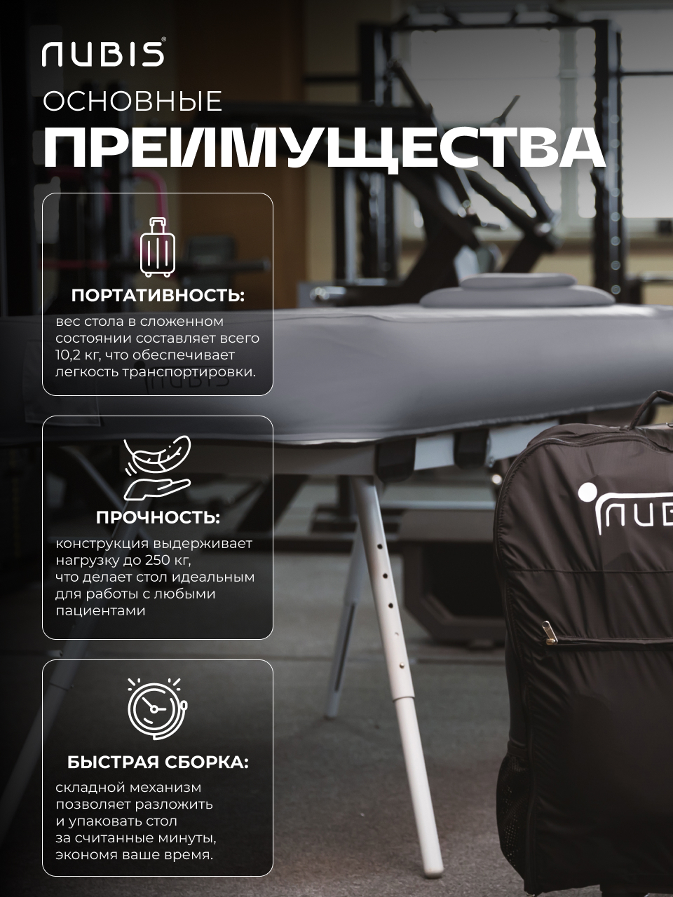 Nubis Pro — это революция в мире выездного массажа и физиотерапии. Этот складной стол создан для экспертов, ценящих мобильность без компромиссов в качестве, устойчивости и комфорте пациента. Забудьте о громоздких конструкциях — теперь ваш профессиональный кабинет всегда с вами, в удобной сумке-чемодане на колесах.