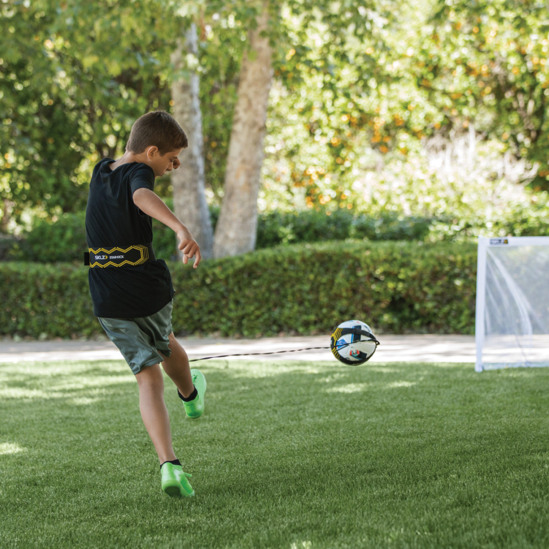 Бегать за мячом больше не нужно: тренируйте удар, полностью сконцентрировавшись на процессе с системой Star Kick Trainer. Футбольный мяч надёжно крепится к поясу спортсмена. Тренажер SKLZ представляет собой прочный неопреновый чехол, способный выдержать самые мощные удары. При ударе трос длиной в 180 см растягивается до 5,5 м, что обеспечивает свободу тренировки с мячом. Вы можете заниматься в любом месте, не боясь разбить соседние окна, повредить машины или ударить находящихся поблизости людей. Совершенствуйте свои навыки жонглирования, вбрасывания, приема и ввода мяча практически в любом месте. Тренажер особенно удобен для начинающих футболистов. В процессе тренировок отрабатывается много реальных ударов. Играть в футбол, тренировать трюки с мячом и поддерживать форму в домашних условиях теперь просто. Это специальный ремень, который надевается на мячик и позволяет отработать технику владения мячом, а так же развить ловкость находясь в помещении. Такой спортивный инвентарь исключит любые поломки вещей в комнате - занятия спортом стали безопаснее. Отличный подарок ребенку футболисту. Игра в футбол дома в квартире или на даче; развивает уровень координации и реакцию, можно тренировать удары ногами и головой, отрабатывать пасы и финты, жонглирование мячом и чеканку.
