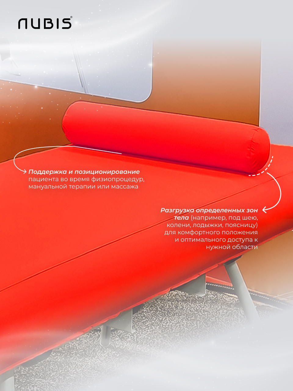 Универсальная цилиндрическая ролл-подушка под шею, ноги, суставы. Подходит для всех столов Nubis. Помещается в фирменную сумку-рюкзак Nubis.